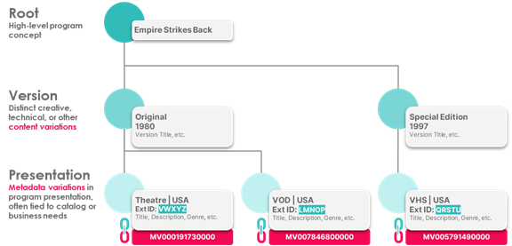 Version: Content variants that cause distinct changes in video programs or episode structure. For Movies, these include both technical changes (for example, 3D, IMAX) or creative changes (for example, extra scenes, dubbed audio). For Shows and Series, versions typically result from similar changes to the programs or to a Series structure, such as different season and episode configurations (sometimes called repackaging).