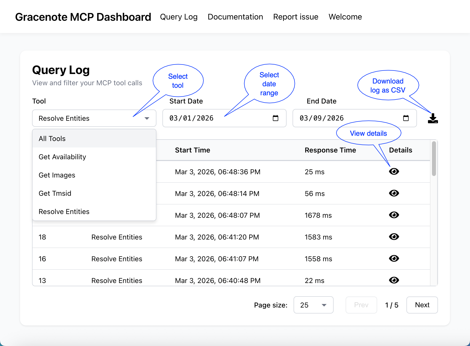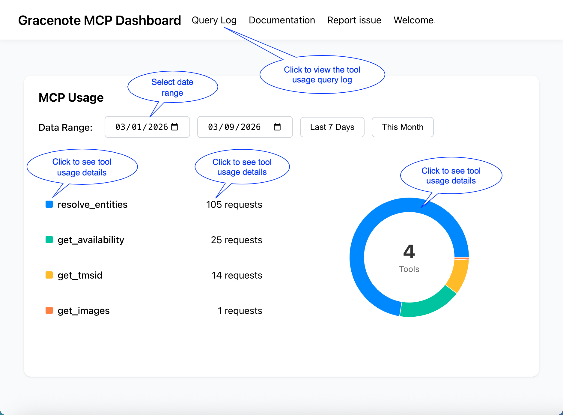 Using the dashboard, you can track your MCP Server usage with based on a date range and by individual tools. This can help you review tool usage over time and identify usage patterns.
