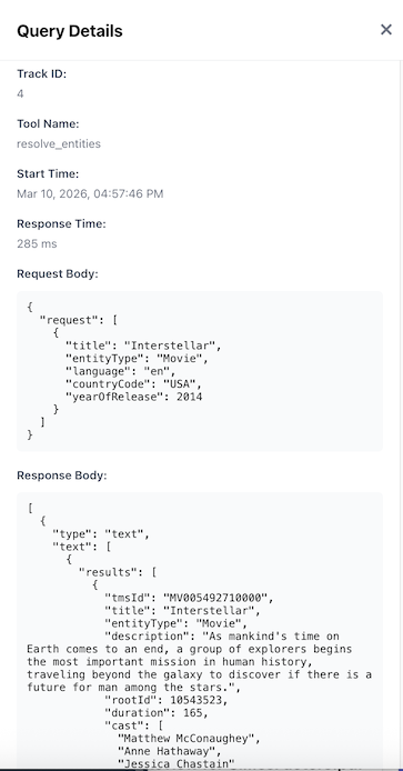 - To view detailed usage data, click the Details view icon. This opens the Query Details page, showing the request body and response for each request.